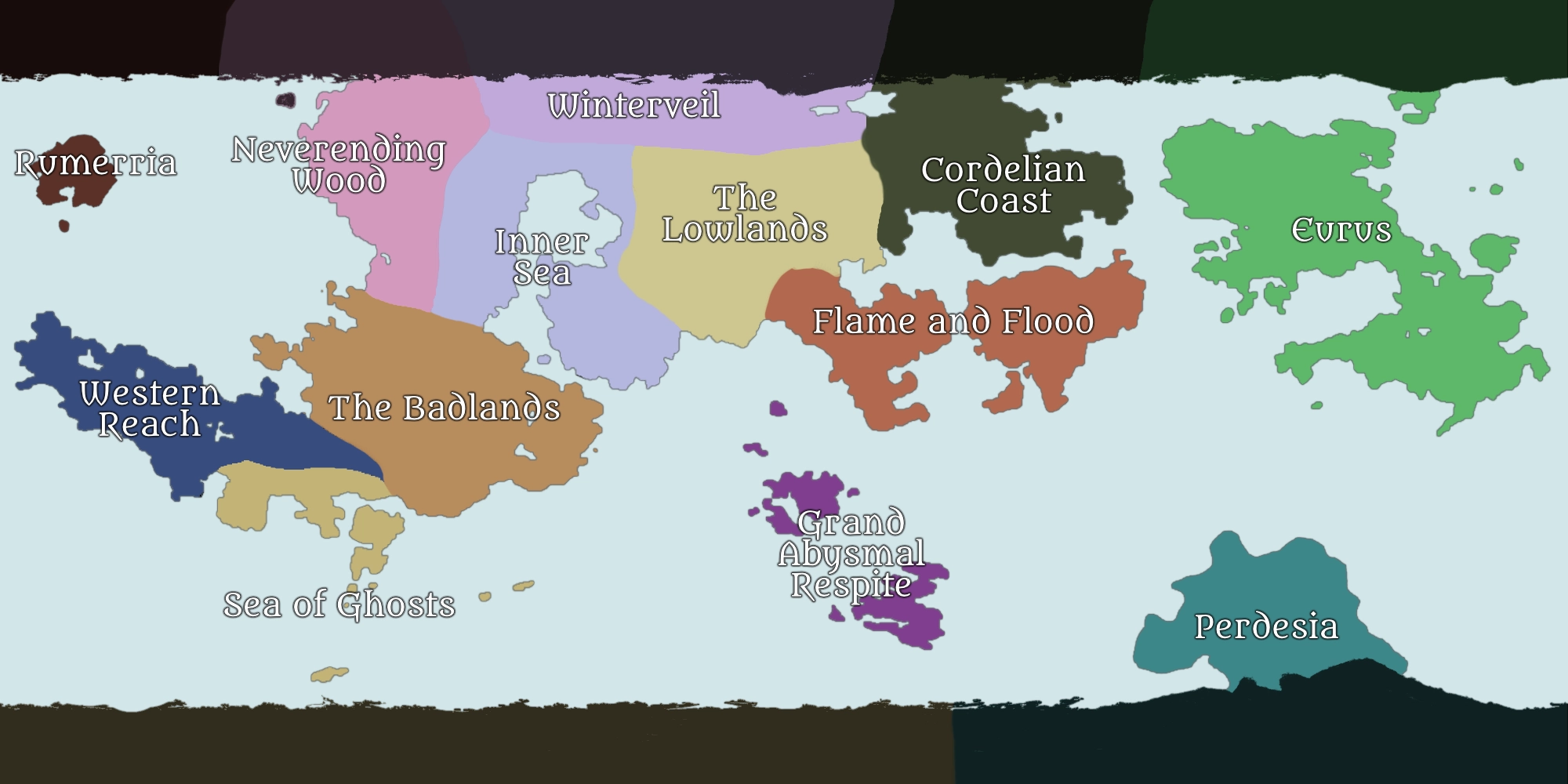 Great Inner Sea: A central inland sea separating the Badlands, Lowlands, Neverending Wood, and Winterveil.