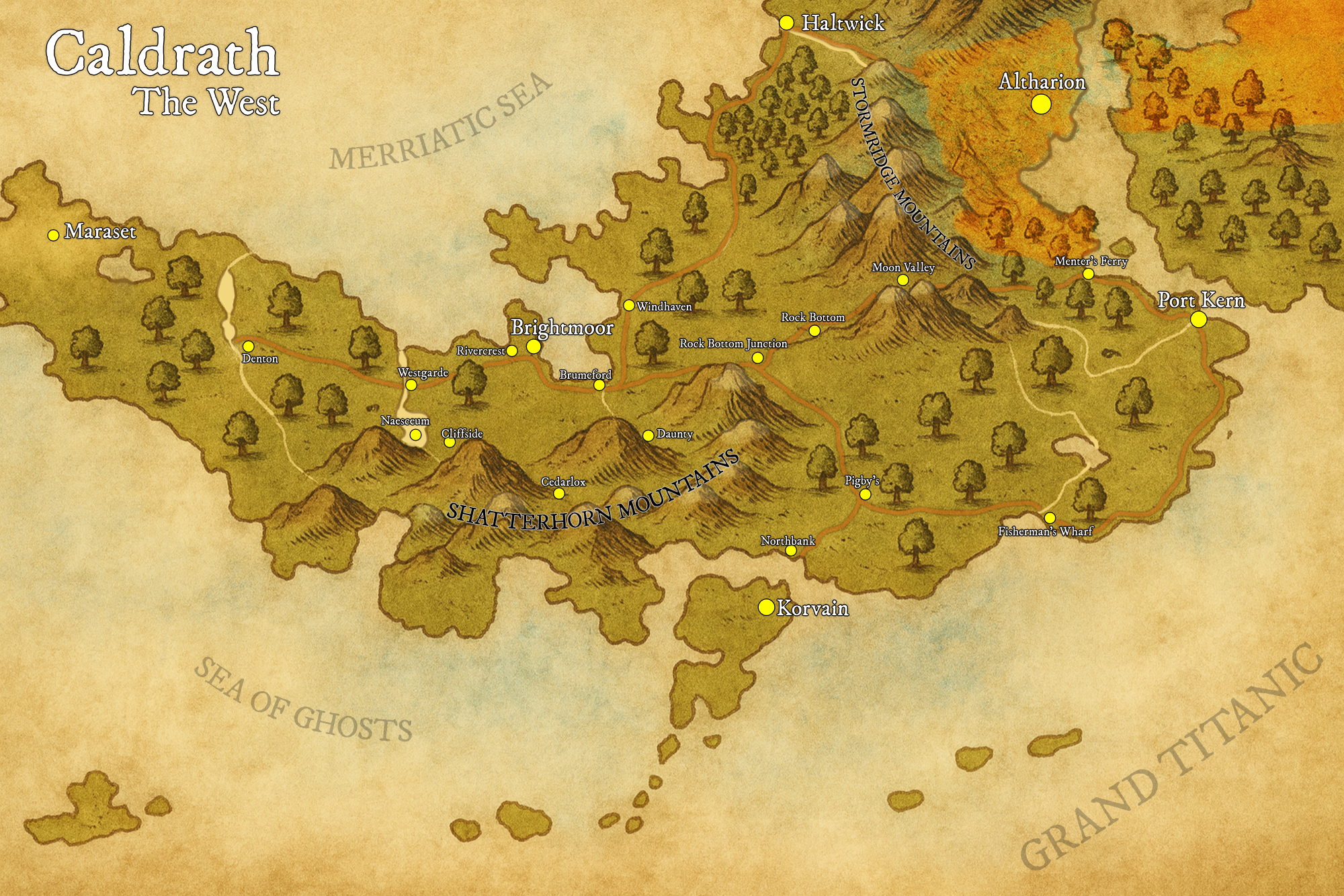 Key Settlements and Features: Maraset, Brightmoor, Port Kern, Korvain, Brumeford, Windhaven, Rivercrest, Westgarde, Nacescurn, Cliffside, Cedarlox, Dauny, Pigby’s, Rock Bottom, Rock Bottom Junction, Moon Valley, Fisherman’s Wharf, Mencer’s Ferry, Haltwick, Alcharion