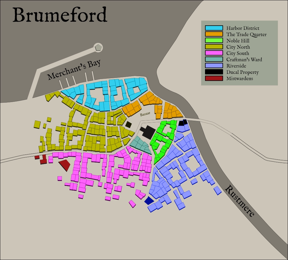 Brumeford thrives on trade and information. A kind word, genuine interest in local customs, and a willingness to share news from your travels will open more doors than a heavy purse. The city rewards those who contribute to its prosperity and punishes those who threaten it.