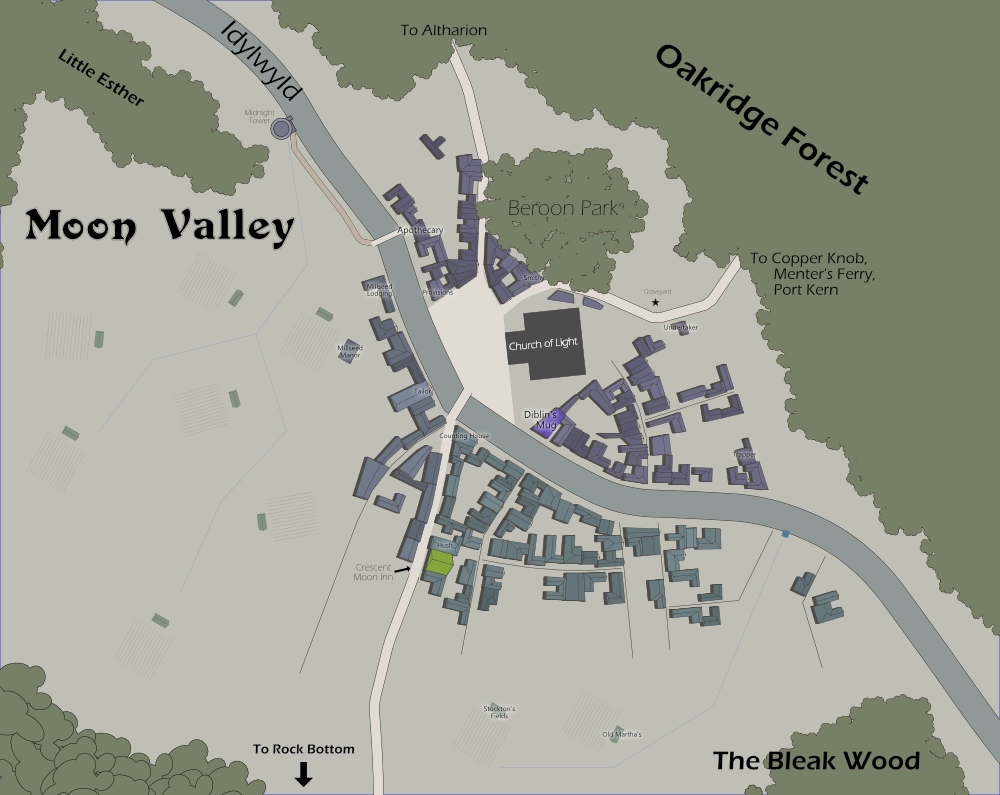 Former forest area now serving as the town park. Pleasant during the day on the edges, though locals say it's best avoided after dark. Foul creatures are rumored to live within it, potentially originating from Oakridge.